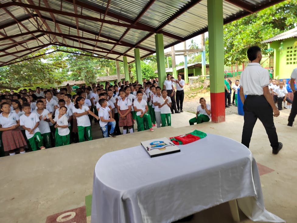 En la parte inferior, abierto el LIBRO DEL SABER con la leyenda: TRABAJO, MORAL Y CIENCIA, en hilos de oro.